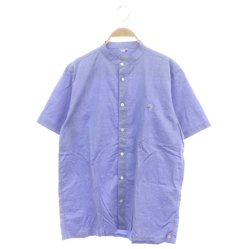 フクロウ刺繡 半袖 バンドカラーシャツ