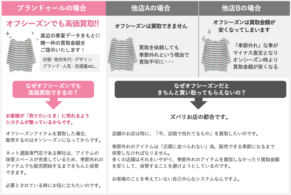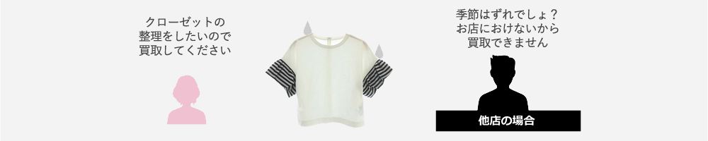 クローゼットの整理をしたいのに、 「オフシーズン物は在庫として持ちたくないから」というお店の都合で買取できなかったり、買取金額が安くなることに納得できますか?