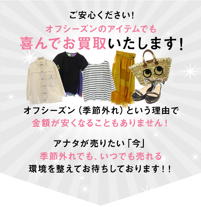 店舗販売のお店は特に、季節外れという理由でアイテムの買取をしてくれなかったり、「季節外れ」という理由で買取金額を安く見積るお店が存在しているので、 オフシーズン物でもきちんと買取してもらえるか心配なさるお客様が多いようです。